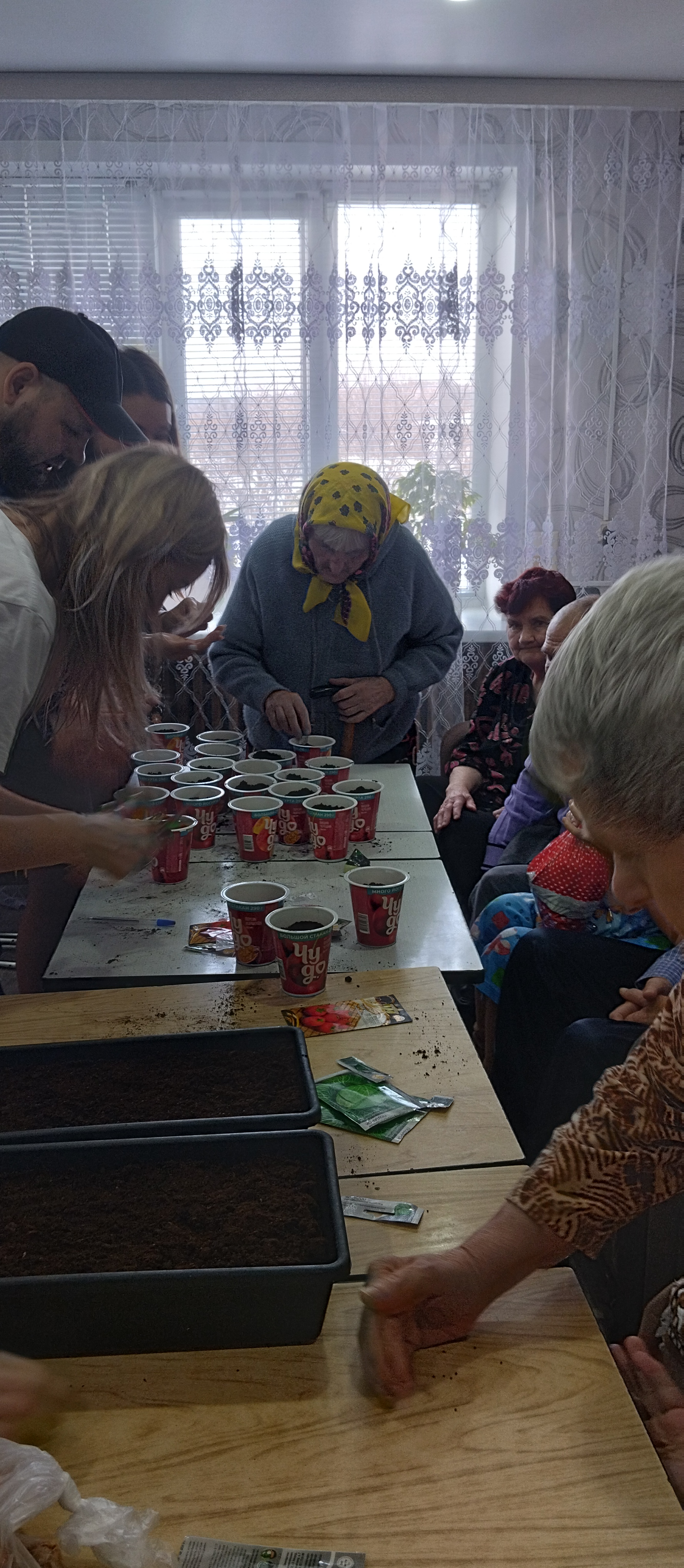 В рамках акции «Добрый огород» волонтеры совместно с бабушками и дедушками посадили семена для будущей рассады. Также передали семена моркови, свеклы и лука, чтобы потом посадить в открытый грунт. Горшки с будущей рассадой разнесли по комнатам для дальнейшего ухода.