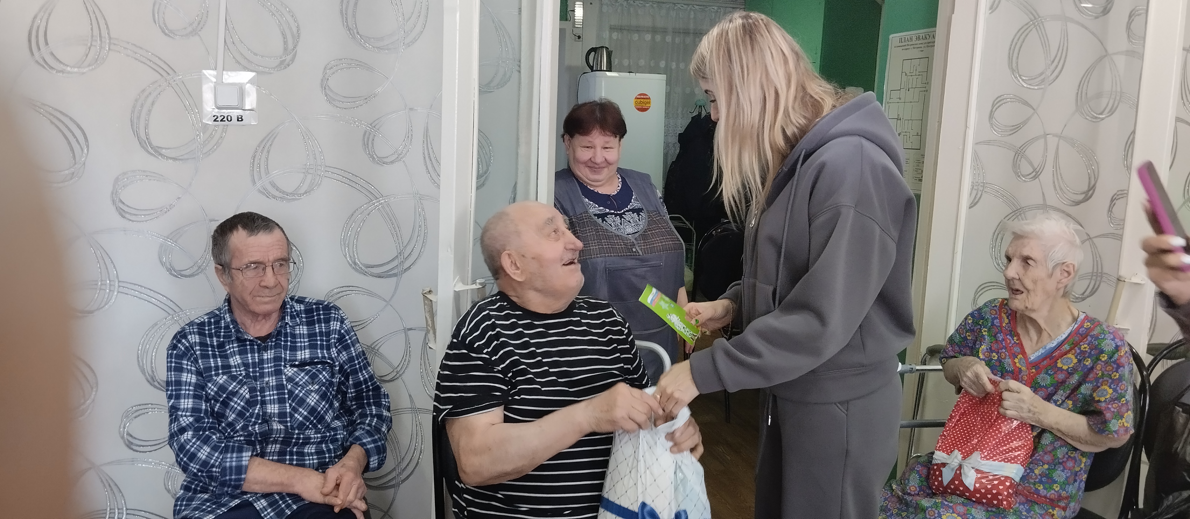 15 марта волонтеры «Старость в радость» посетили отделение стационарного обслуживания граждан пожилого возраста и инвалидов в с.Пестровка. Волонтеры поздравили всех присутствующих с прошедшими праздниками – Днем Защитника Отечества и Международным Женским днем и вручили бабушкам и дедушкам сладкие подарки, открытки.